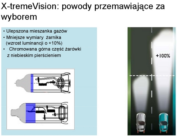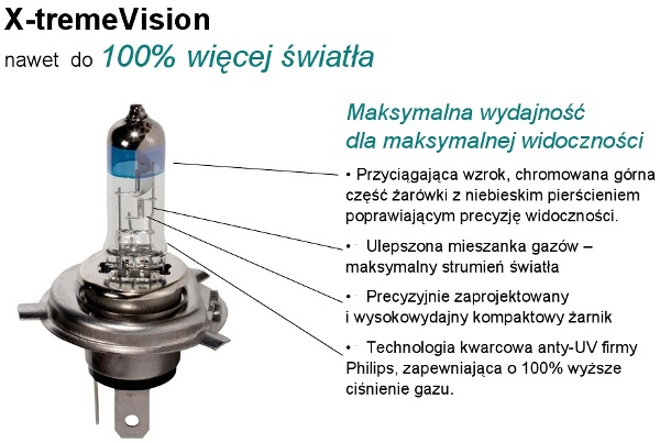 Żarówki                                                                          halogenowe                                                                                                               X-treme                                      Vision                                      - w porównaniu z tradycyjnymi żarówkami dają                                      do  100% więcej światła co powoduje lepsze                                      oświetlenie drogi i poprawia                                      widoczność szczególnie w nocy i przy złej                                      pogodzie przez co prowadzenie samochodu                                      staje się bezpieczniejsze i mniej męczące.                                      Dla osób, które cenią sobie najwyższe osiągi                                     żarówki                                                                                                                                                      X-treme                                      Vision                                      świecą dalej niż inne dostępne na rynku -                                      Po prostu                                      najmocniejsza żarówka jaką kiedykolwiek                                      wyprodukowano ! Bez jakichkolwiek                                      kompromisów w zakresie trwałości !