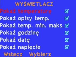 Po wyświetleniu napisu termometr wyświetla informacje dotyczące temperatury, czasu, napięcia, ostrzeżeń itp. Oczywiście jeżeli nie chcesz, aby którakolwiek informacja została wyświetlona, przechodzisz do menu w którym ustawiasz własne preferencje.