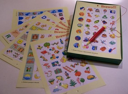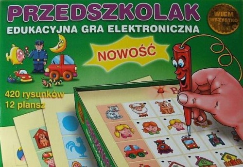 PREZENT DLA TWOJEGO DZIECKA Gra elektroniczna „Przedszkolak” Gra elektroniczna „Przedszkolak” przeznaczona jest dla dzieci w wieku 4-8 lat. W trakcie zabawy dzieci rozwijają analizę i syntezę wzrokową, ucząc się podnoszą swój poziom intelektualny.Gra pomaga dzieciom w wyszukiwaniu różnic, w odnajdywaniu i kojarzeniu wspólnych cech oraz w poznawaniu kształtów. Podczas zabawy dzieci poznają zwierzęta i ich zwyczaje, gdzie mieszkają i czym się odżywiają. Na 12 planszach znajduje się 420 rysunków, które należy ze sobą skojarzyć. Przy każdym rysunku umieszczony jest punkt. Jeżeli gracz zna odpowiedź dotyka odpowiedni punkt na planszy. Przy prawidłowej odpowiedzi lampka zapali się.