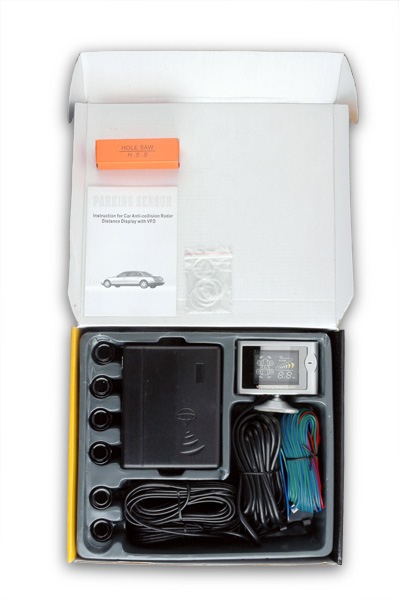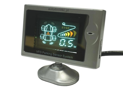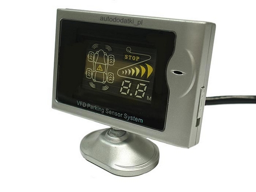 Wyświetlacz VFD ma bardzo małe wymiary: 85mm x 55mm x 15mm wraz z regulowaną stopką: 85mm x 75mm x 15mmMONTAŻ Instalacja czujnika jest opisana w dołączonej instrukcji. Generalnie polega na podłączeniu wyświetlacza z jednostką centralną za pomocą 6-metrowego kabla. Jednostkę centralną umieszcza się w dogodnym miejscu w bagażniku. Do centralki podłącza się każdy z 6-ciu sensorów. Sensory montuje się w zderzakach (2 - przód, 4 - tył). Zasilanie pochodzi od światła cofania (tył) oraz zasilania stałego samochodu, dzięki czemu po przekręceniu kluczyka przednie sensory są stale aktywne. Po załączeniu wstecznego biegu przednie sensory są odłączane, wyświetlane są informacje oraz emitowane dźwiękowe sygnały ostrzegające o przeszkodach znajdujących się z tyłu auta. Wyświetlacz posiada wyłącznik wbudowanego głośnika - dzięki niemu podczas zwykłej jazdy (np. w korku) nie będą emitowane dźwiękowe sygnały ostrzegawcze. Wyświetlacz mocuje się przy pomocy bardzo trwałej i silnej dwustronnej taśmy samoprzylepnej (preaplikowanej) w dogodnym dla kierowcy miejscu.