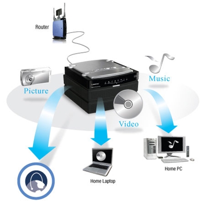 Linksys NAS200-EU posiada wbudowany serwer multimedialny umożliwiający streaming danych do komputera, cyfrowych urządzeń AV UPnP. | |  | | Specyfikacja: -