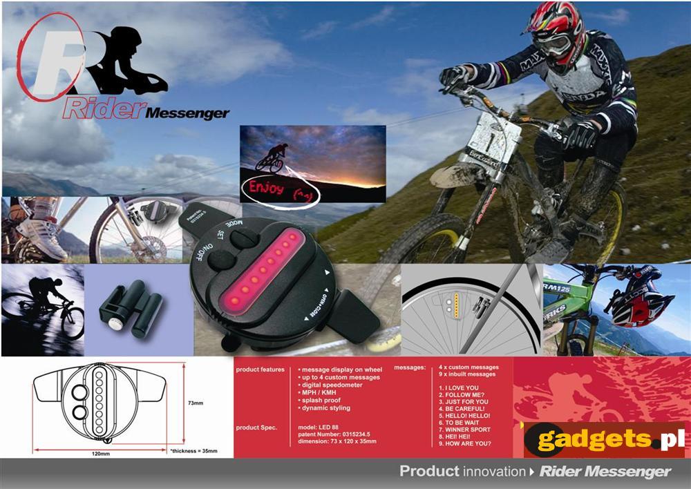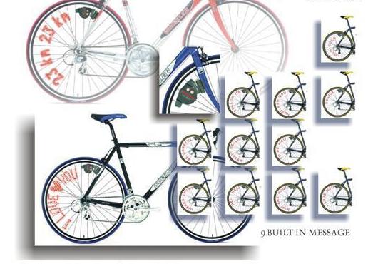 Możesz sam zdecydować jaki tekst ma się wyświetlić na kole Twojego roweru, gdyż urządzenie ma zaprogramowane wiadomości w pamięci