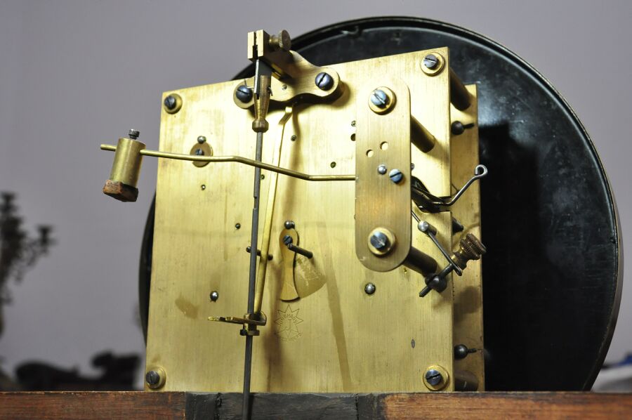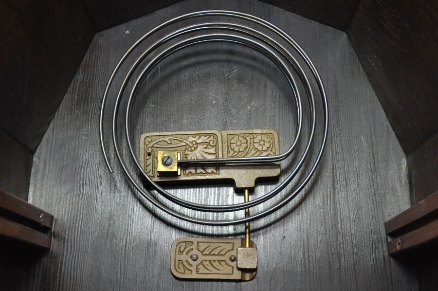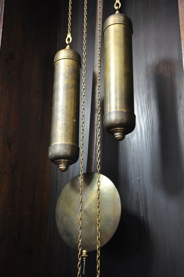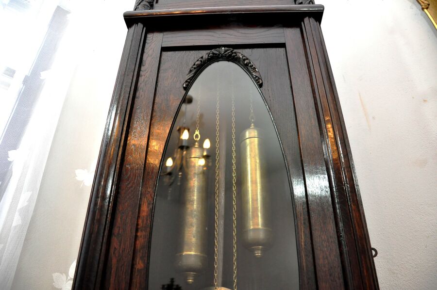 …sygnowany, dwu-wagowy mechanizm bijący pięknym, głębokim i czystym dźwiękiem, co dwa kwadranse.