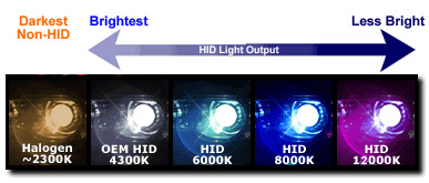Mniejsze zmęczenie wzroku - Światło emitowane przez ksenon ma barwę zbliżoną do bieli światła dziennego (4500 - 8000K), do którego wzrok jest najlepiej przystosowany. Dzięki temu kierowca łatwiej spostrzega obiekty, szybciej koncentruje na nich wzrok i mniej męczy oczy. Standardowa żarówka halogenowa emituje światło o żółtym zabarwieniu (3200K) wymagającym bardziej intensywnej pracy wzroku. Dla kierowcy jadącego w przeciwnym kierunku światło lamp HID jest także mniej uciążliwe