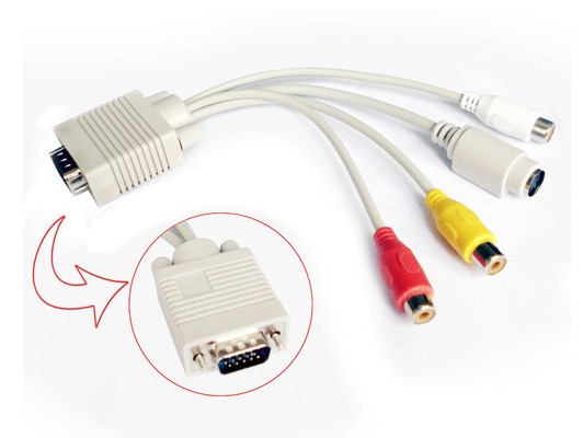 • Końcówki w adapterze: 1x VGA (wyjście monitora, 15 pin męskie), 1x gniazdo S-VHS/S-Video (S-Video Mini Din 4 pin żeńskie), 3x RCA-gniazdo (żeńskie)