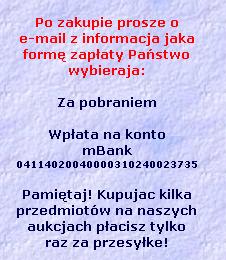 Wylicytowany towar wysyłamy zaraz po otrzymaniu wpłaty lub za pobraniem. Nie musicie Państwo czekać na przesyłkę do zakończenia aukcji!!!
