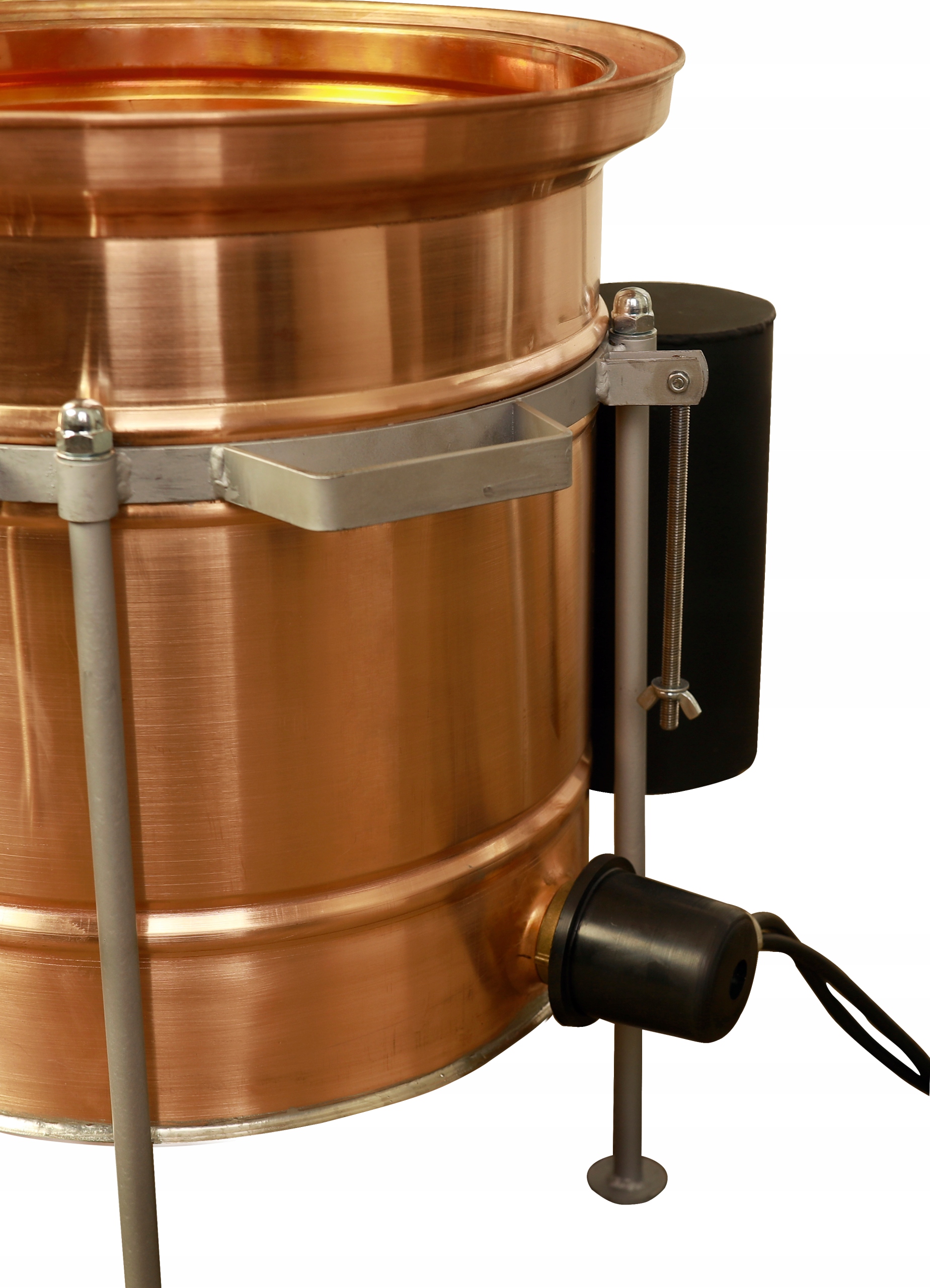 W górnej części zbiornika znajduje się wieniec wodny, pełniący funkcję uszczelnienia z pokrywą, do której możemy podłączyć za pomocą klamry Tri-Clamp kolumnę półkową lub kielich wodny dzięki czemu otrzymujemy dwa różne destylatory.