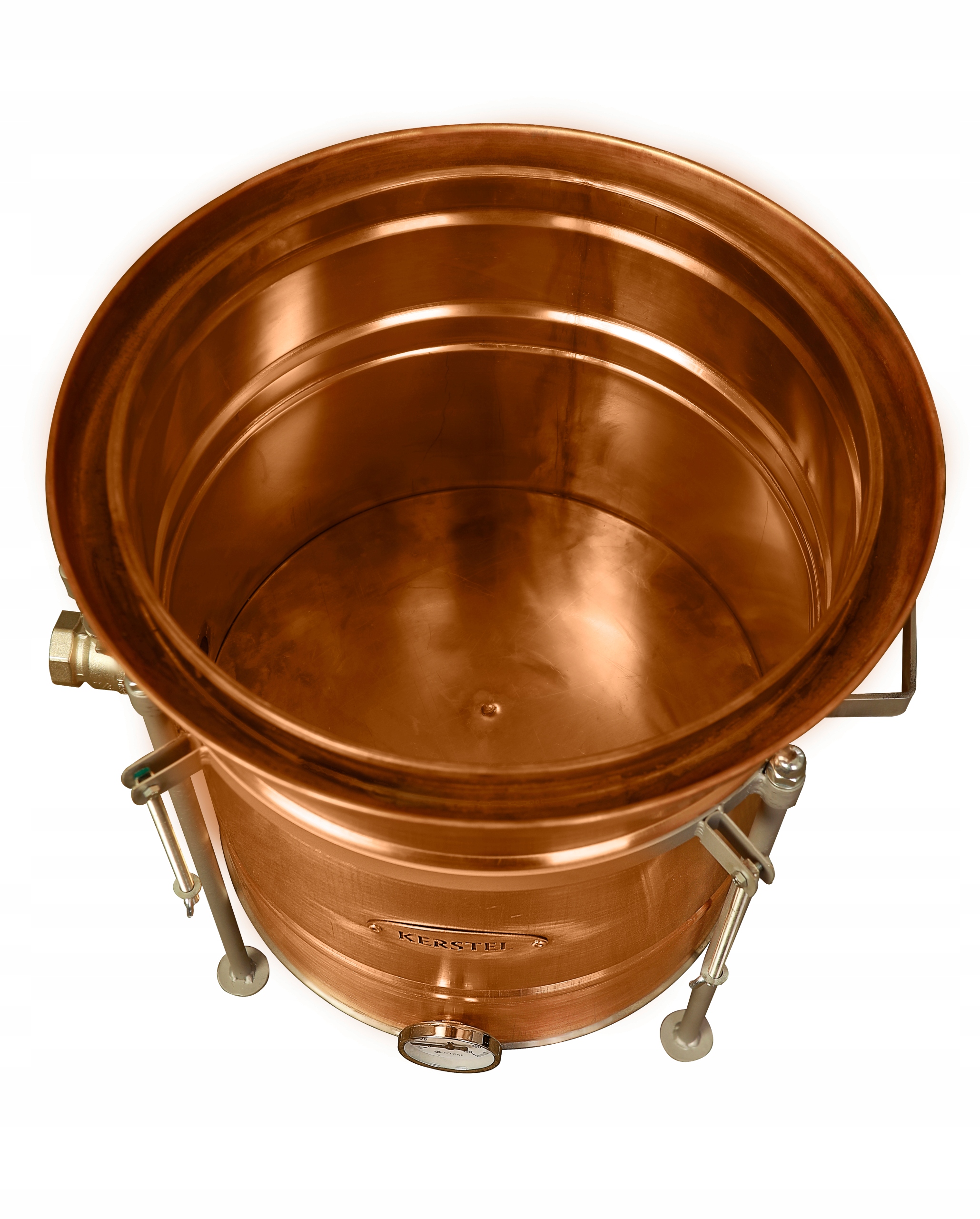 Kocioł wykonany jest z blachy miedzianej (99% miedzi) o grubości 1 do 2 mm, z podwójnym dnem wyposażony w: