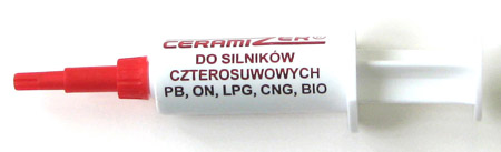 |  | Przed (przebieg 181341 km) | Po 2124 km (przebieg 183474 km) |   | Obroty biegu jałowego | 1080 RMP | 920 RMP |   | CO | 1,73 | 1,43 (zmniejszenie o 17 %) |   | CO2 | 19,9 | 19,2 (zmniejszenie o 3,6 %) |   | HC | 200 | 160 (zmniejszenie o 20 %) |   | O2 | 0 | 0 |  Zmniejszenie oporów tarcia po ceramizacji spowodowało zmniejszenie obrotów biegu jałowego z 1080 obr/min do 920 obr/min i jednocześnie wyrównanie pracy silnika. Zaobserwowano zmianę koloru elektrod świec na jaśniejszy, co sugeruje zmniejszenie "apetytu" na olej.